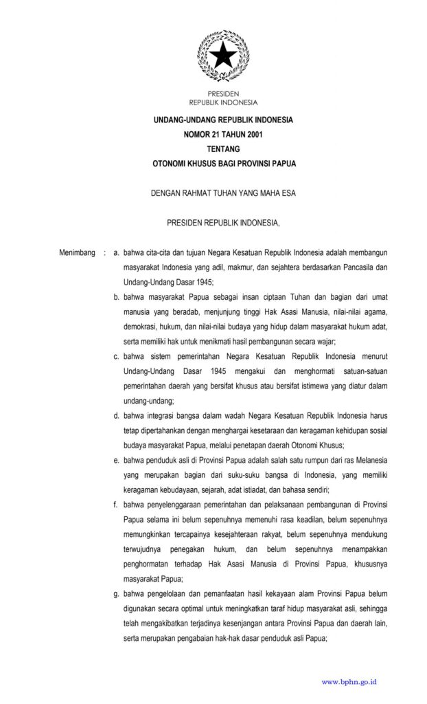 UU No. 21 Tahun 2001 tentang Otonomi Khusus Bagi Provinsi Papua