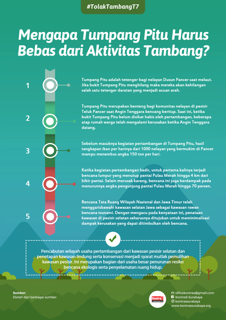 - Pembiaran terhadap konflik-konflik pertambangan dan bahkan pelanggaran perijinan terhadap wilayah yang mempunyai nilai penting secara ekologis tidak bisa terus dibiarkan. Kita tengah menghadapi konsekuensi dari semakin banyaknya wilayah-wilayah lindung yang rusak dengan bentuk peningkatan jumlah bencana ekologis setiap tahunnya di Jawa Timur. Oleh sebab itu pencabutan wilayah usaha pertambangan dari kawasan pesisir selatan dan penetapan kawasan lindung dan konservasi menjadi syarat mutlak pemulihan kawasan pesisir dan menjadi bagian dari usaha besar penurunan resiko bencana ekologis serta penyelamatan ruang hidup rakyat.