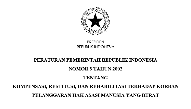 Return to "Peraturan Pemerintah Nomor 3 Tahun 2002 Tentang Kompensasi, Restitusi, dan Rehabilitasi Terhadap…" PP-Nomor-3-Tahun-2002