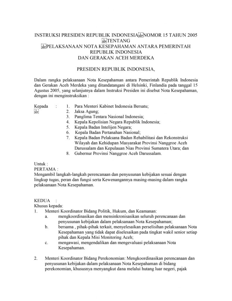 Instruksi Presiden Republik Indonesia Nomor 15 Tahun 2005 tentang Pelaksanaan Nota Kesepahaman antara Pemerintah Republik Indonesia dan Gerakan Aceh Merdeka.